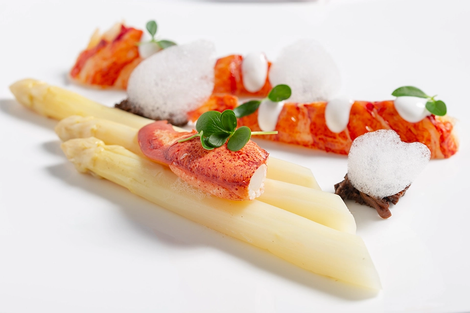 Options on the menu include boiled lobster served with white asparagus and morel mushrooms (THB 1,850++), white asparagus soup with stuffed morel mushrooms and grilled foie gras (THB 950++), smoked white asparagus Tortelli with dew foam and Parmesan cheese (THB 950++), grilled turbot fish with white asparagus and hollandaise sauce (THB 1,950++), and Veal Tenderloin a la Plancha with morel mushrooms and red wine Madeira sauce priced (THB 2,350).