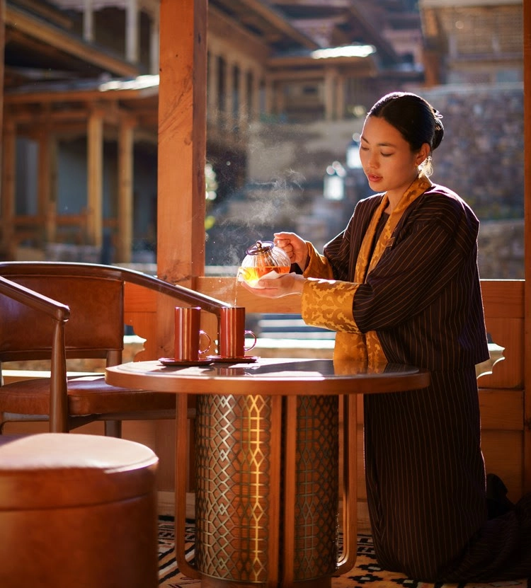 The resort’s spaces unfold with a similar sense of restraint. At its dining room, views stretch across the valley towards forested slopes, while menus move between Bhutanese flavours and broader regional influences. Elsewhere, a dedicated experience centre offers small-scale encounters with local culture, from stupa-making to traditional tea rituals—practices that favour participation over performance.