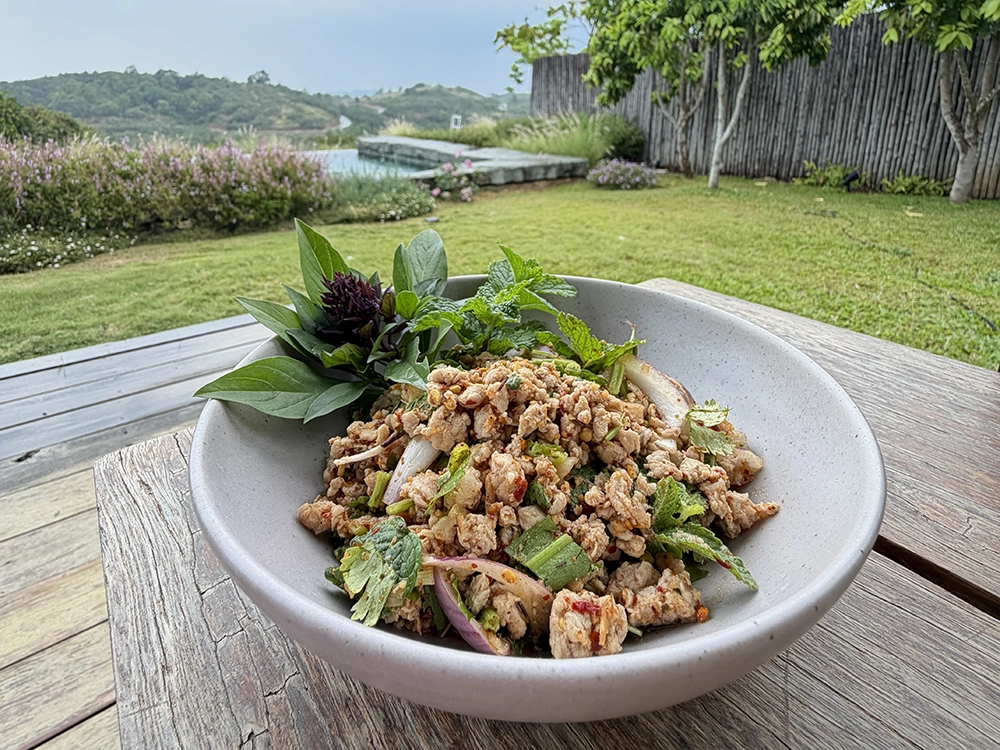 Everything is served with sticky rice—an essential part of Isan cuisine—and a selection of organic vegetables grown on the property. That closeness between garden and kitchen feels intentional, and reflects a broader shift in Thailand’s dining scene, where local sourcing is becoming more than just a talking point.
