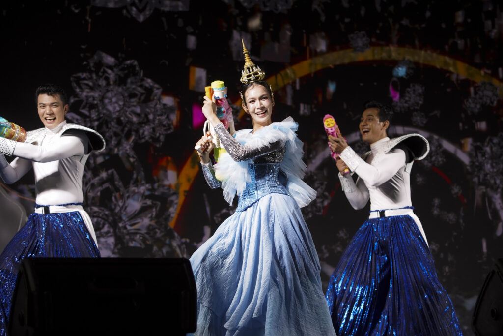 At Benjakitti Park, the Maha Songkran World Water Festival (April 11–15) unfolds across broad promenades with the skyline as backdrop. The setting immediately changes the texture of the celebration: there is space to move, to observe, to step away. The opening procession, introducing the Songkran goddess Nang Raksadevi, leans into pageantry, blending traditional iconography with a polished, almost theatrical presentation.